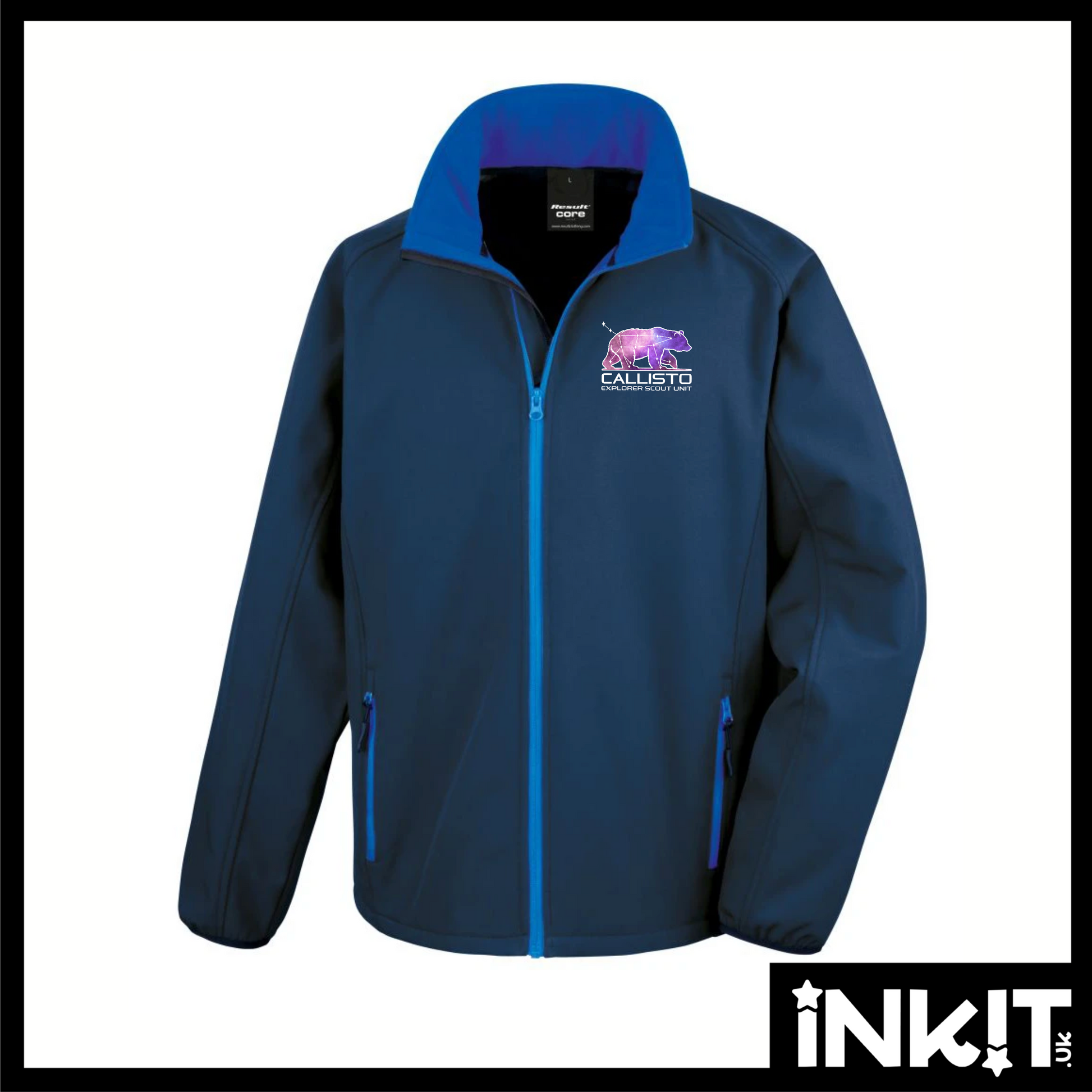 Contrast colour double layer soft shell jacket, printed with logo on left chest, logo across the back & small scout icon on right arm.